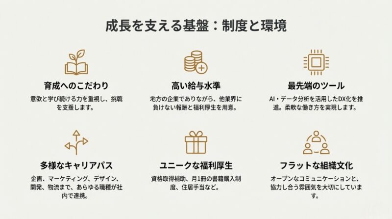 | 福利厚生 | ・交通費支給(上限17,000円) ・あわら市内にアパートを借りる場合の住居手当(20,000円 独身に限る) ・労災・雇用保険 ・健康保険、厚生年金保険、雇用保険、労災保険 ・服装自由 ・毎月1冊本を購入できる制度 ・資格取得補助 ・懇親会等の社内イベント ・社員割引価格での取扱商品の購入 |