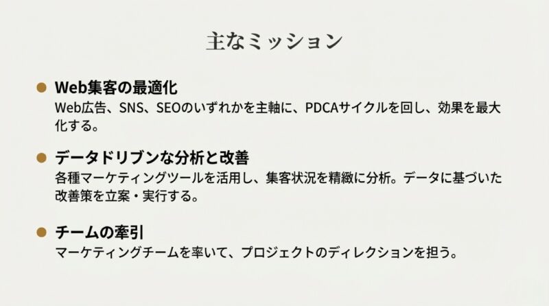 | 必要な経験・スキルなど | ・Web広告・SNS運用・SEOなどの実務経験が1年以上ある方優遇 ・プロジェクトのディレクション経験がある方優遇 ・マネジメント経験のある方優遇 |