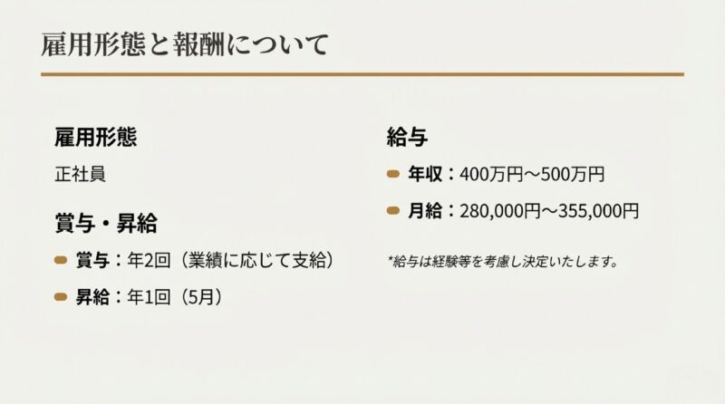 | 給与 | 年収400万円〜500万円 月給280,000〜355,000円 賞与あり(年2回、業績に応じて支給) *給与は応募者の経験等も考慮し決定いたします。 |