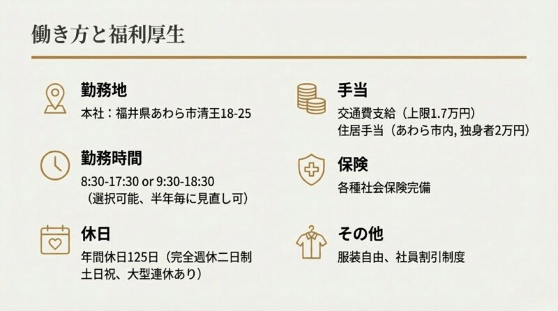 | 勤務地 | 【本社】福井県あわら市清王18-25 敷地内は禁煙です。喫煙スペースなし。 |